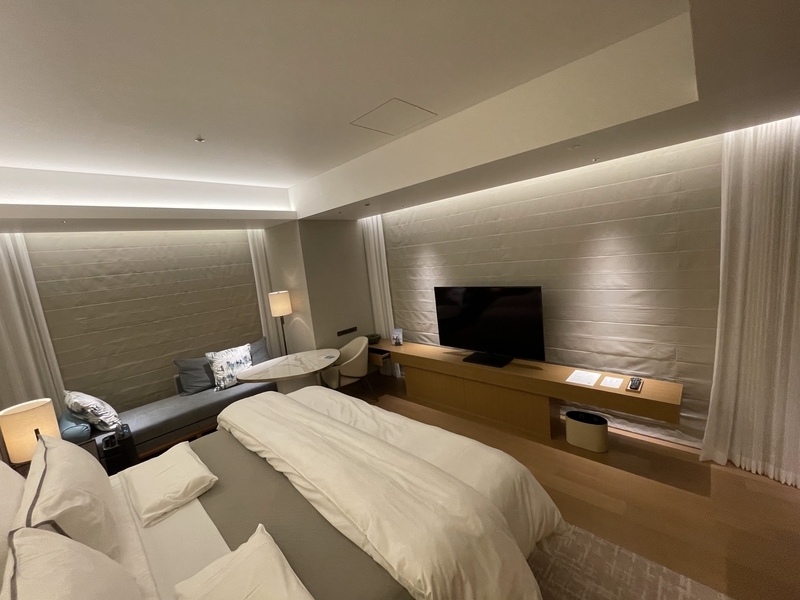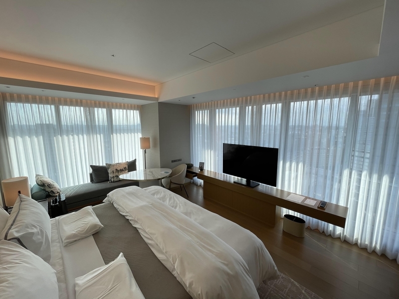 室内に入ると、まず目に入るのが大きな窓とツインのウェスティンヘブンリーベッド。高級感のある寝具に包まれて、まるで雲の上にいるような寝心地を体験できます。
